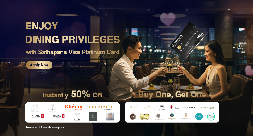 Enjoy exclusive culinary experiences and unparalleled rewards with your Sathapana Visa Platinum Card. Indulge in special offers such as: