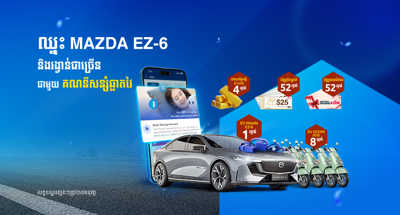 សន្សំបានការប្រាក់ខ្ពស់ ហើយឈ្នះរង្វាន់ទៀត! លោកអ្នកគ្រាន់តែបើកគណនីសន្សំឆ្លាតវៃ ឬដាក់ប្រាក់បញ្ញើបន្ថែមទៅក្នុងគណនីសន្សំឆ្លាតវៃ ដែលមានស្រាប់ នោះលោកអ្នកនឹងមានឱកាសឈ្នះរង្វាន់ធំជាច្រើនរួមមាន ឡានអគ្គិសនីស៊េរីទំនើប MAZDA EZ-6 ចំនួន 1រង្វាន់ ម៉ូតូអគ្គិសនី YADEA OCEAN 2025 ចំនួន 8 រង្វាន់ មាសសុទ្ធតម្លៃ 1,500 ដុល្លារអាមេរិក ចំនួន 4 រង្វាន់ និងប័ណ្ណបញ្ចុះតម្លៃ Aeon Mall ដែលមានតម្លៃ25 ដុល្លារអាមេរិក ចំនួន 52 រង្វាន់ និងបណ្ណធានារ៉ាប់រង រហូតដល់ 3,000 ដុល្លារអាមេរិកពីក្រុមហ៊ុនForte ចំនួន 52 រង្វាន់។